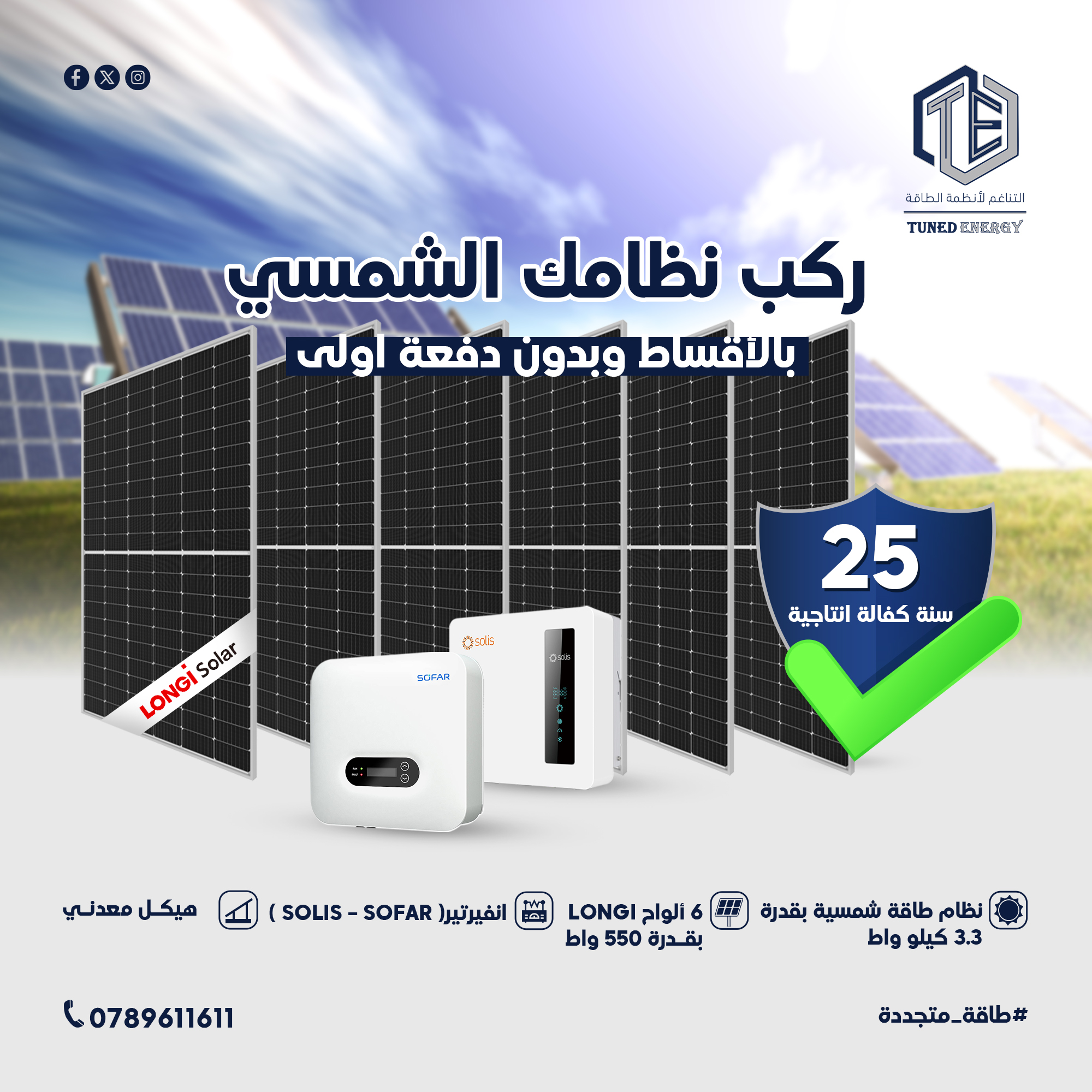 عرض خاص للمتقاعدين العسكريين بــــ 1620 دينار فقط و بالتقسيط بدون دفعة اولى من خلال شركة التناغم لأنظمة الطاقة